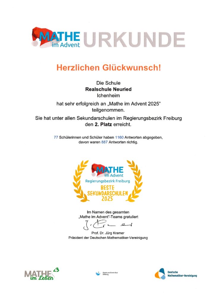 Die Realschule Neuried hat sich mit Ihren Schülerinnen und Schülern und Ihren Klassen daran sehr erfolgreich beteiligt. Darüber freute sich die Gisela und Erwin Sick Stiftung und hat eine Abordnung unserer Schule am Freitag, 06. Februar 2026 im Gisela Sick Bildungshaus in Waldkirch einen Preis verliehen.